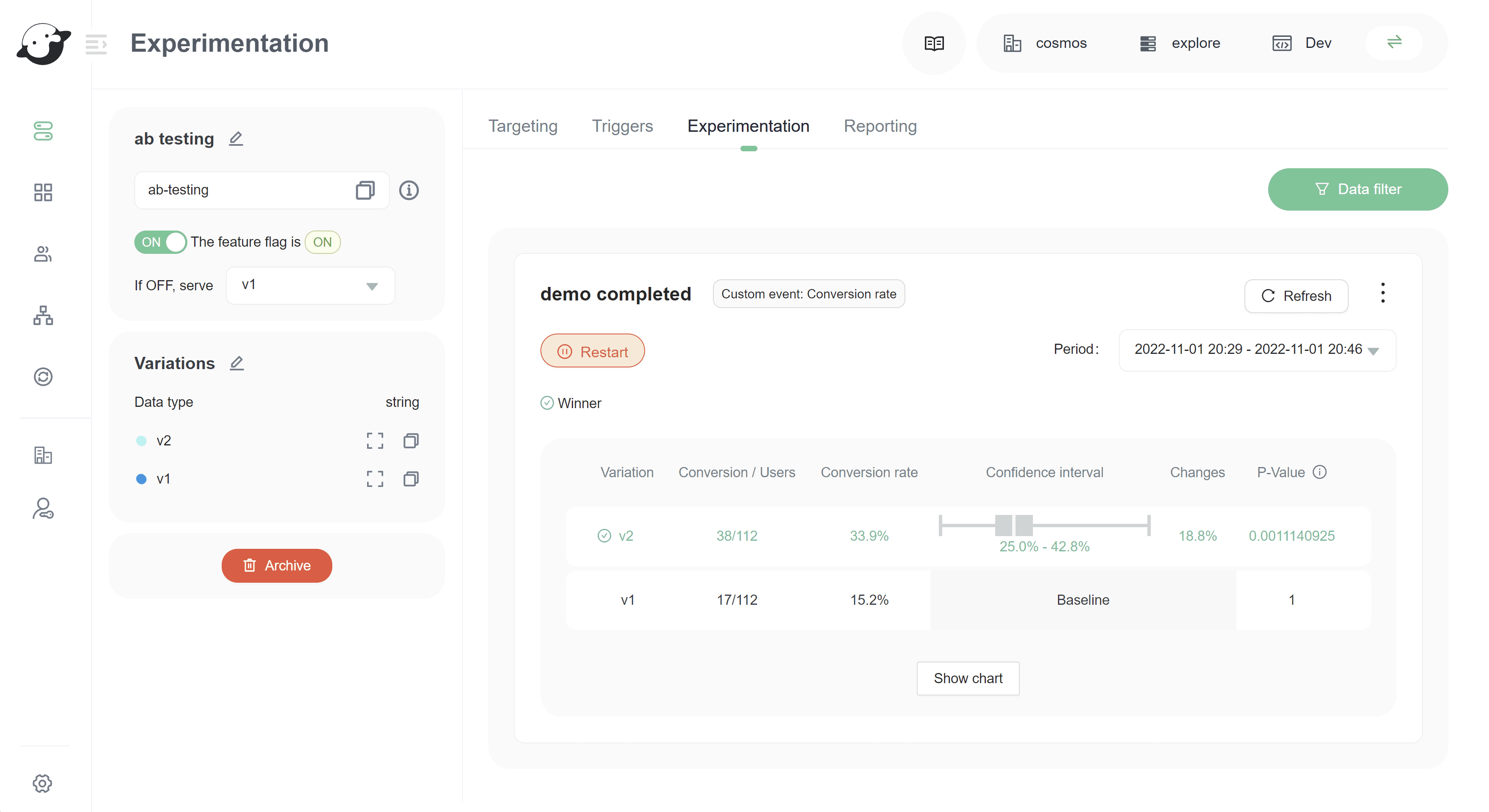 Experiment data is collected on Experimentation tab in feature flag detail page, which displays experiment data in near-real time.