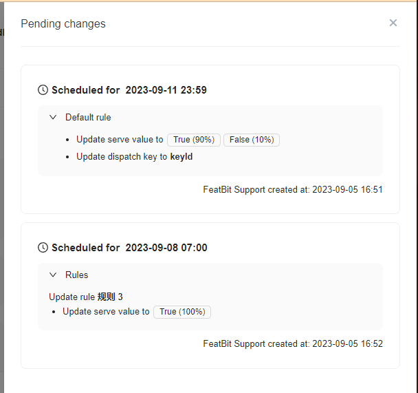 To view the complete list of changes, click on the clock icon. A panel appears that displays all the pending changes that are scheduled for this flag. The changes are listed chronologically, with the earliest upcoming change listed first:\