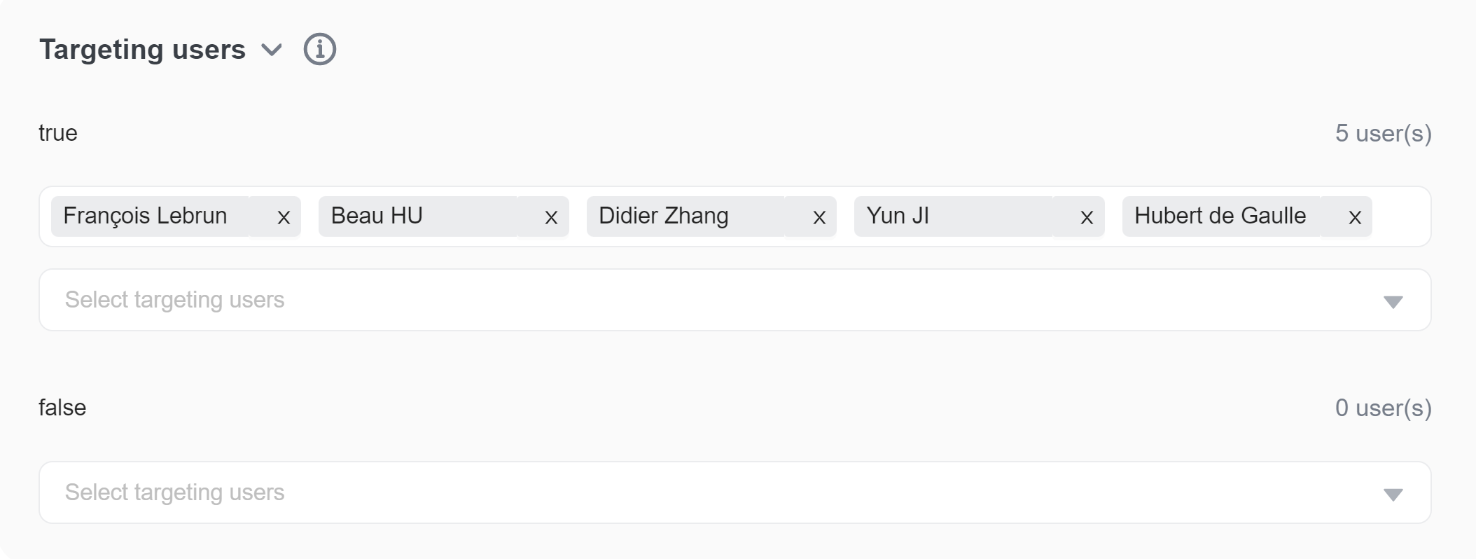 In the screenshot below, specific users are receiving the first variation of a flag. That flag is targeted to them. This means that these users will receive that flag variation when they access the flag.