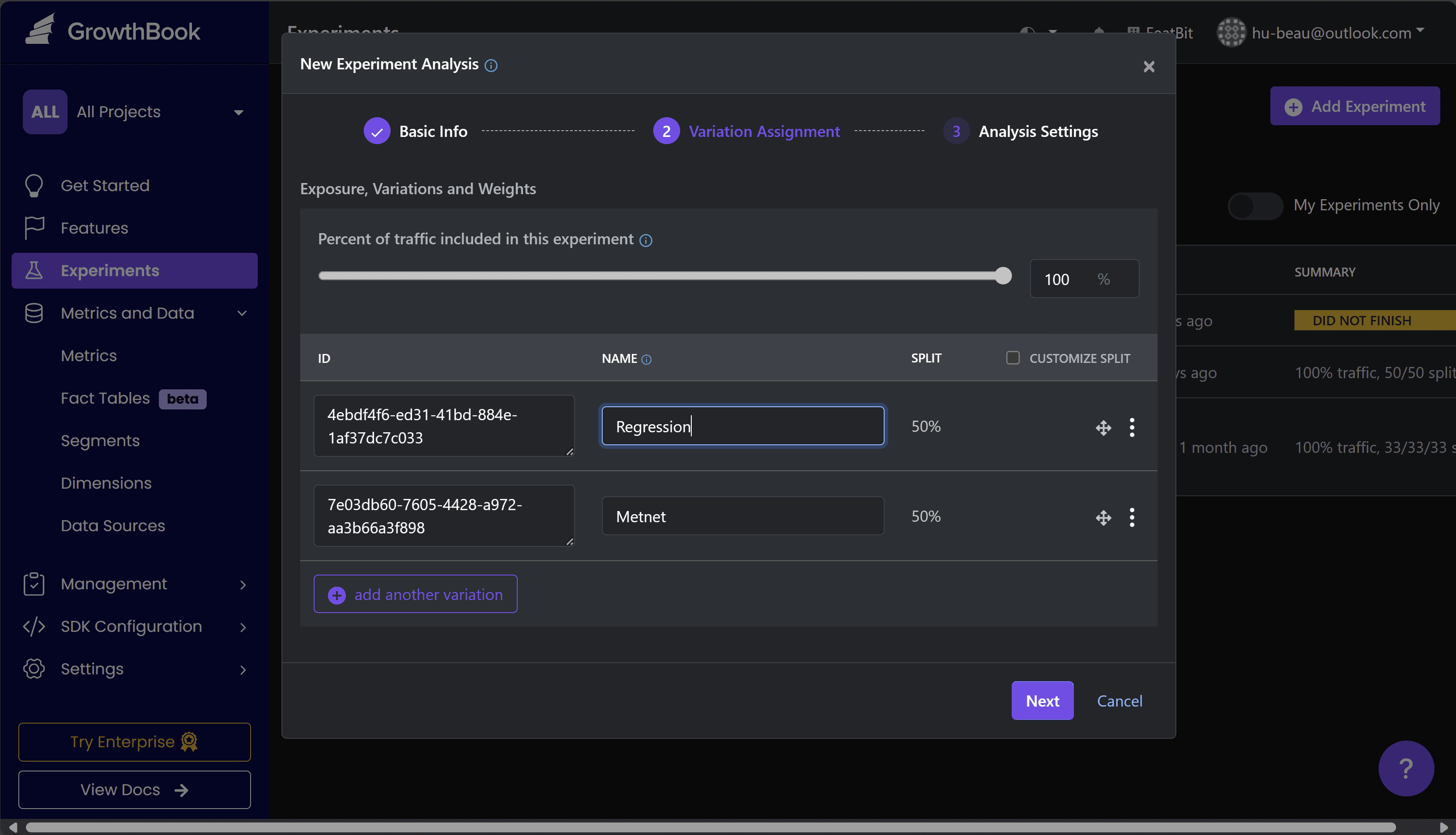 Follow the guide in the 'New Experiment Analysis' popup window. Choose your Experiment Assignment Table and Goal metric, then click the Save button.