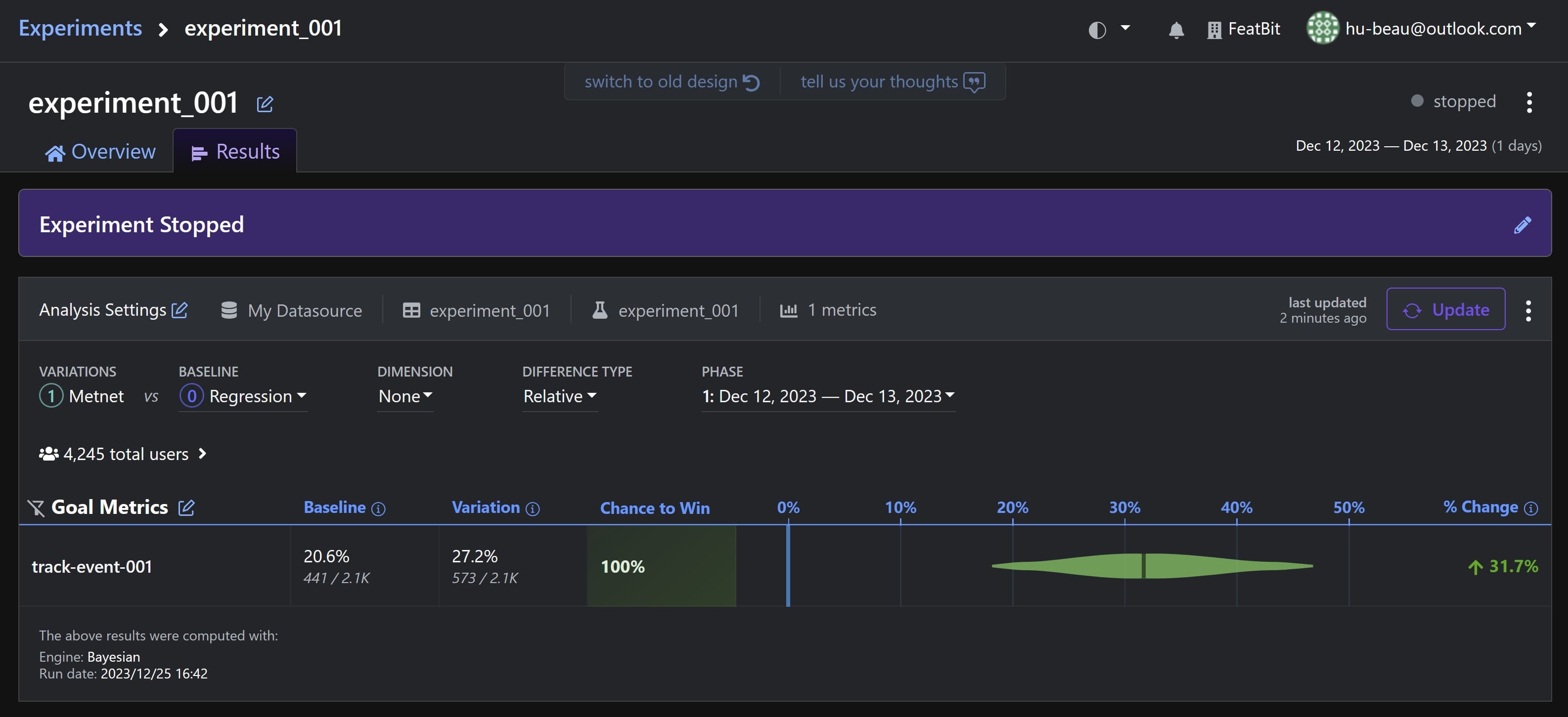 After this, you can view your experiment. In the 'Results' panel, click the Update button. You will then see the experiment report as shown above.